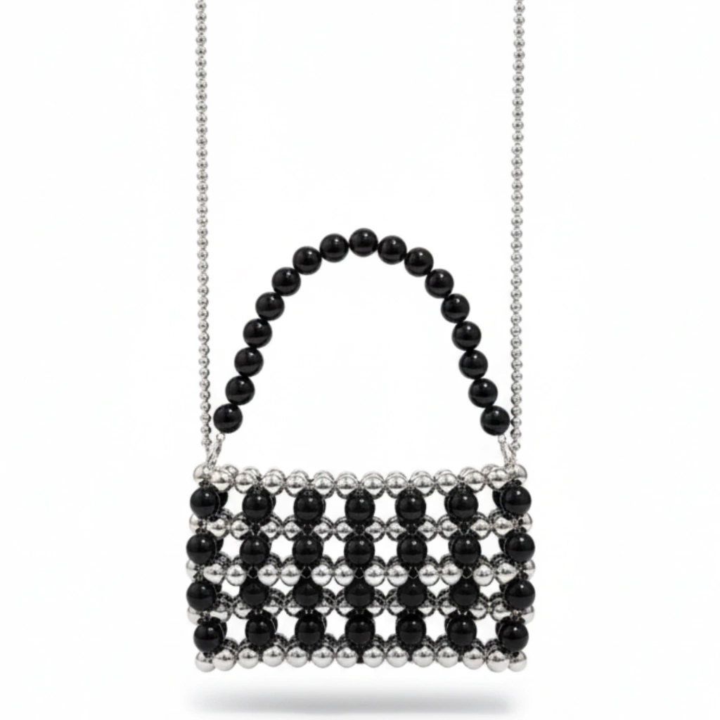 Bolsa retangular com estampa de bolas, moderna e elegante, ideal para complementar looks com estilo.